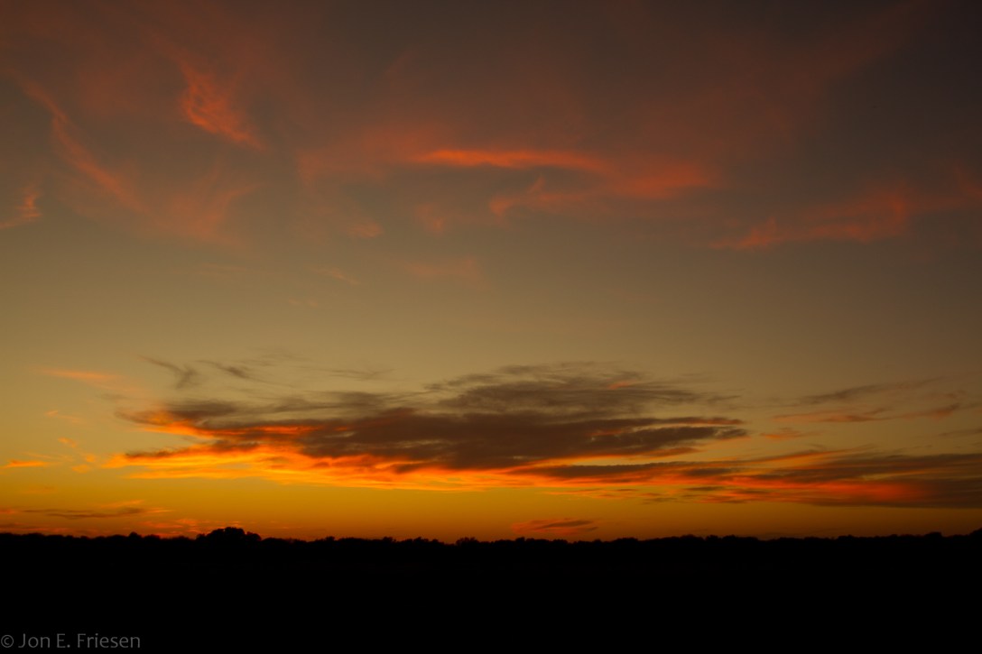 Kansas has a big sky. Perhaps not as big as Montana, but BIG. And with big skies come big sunsets. As the sun lowers in the sky, thin wisps of clouds appear in a day otherwise cloudless. And as the sun sinks into the earth, the warm oranges, yellow, and pinks appear in various forms – ending the day in a wash of color.