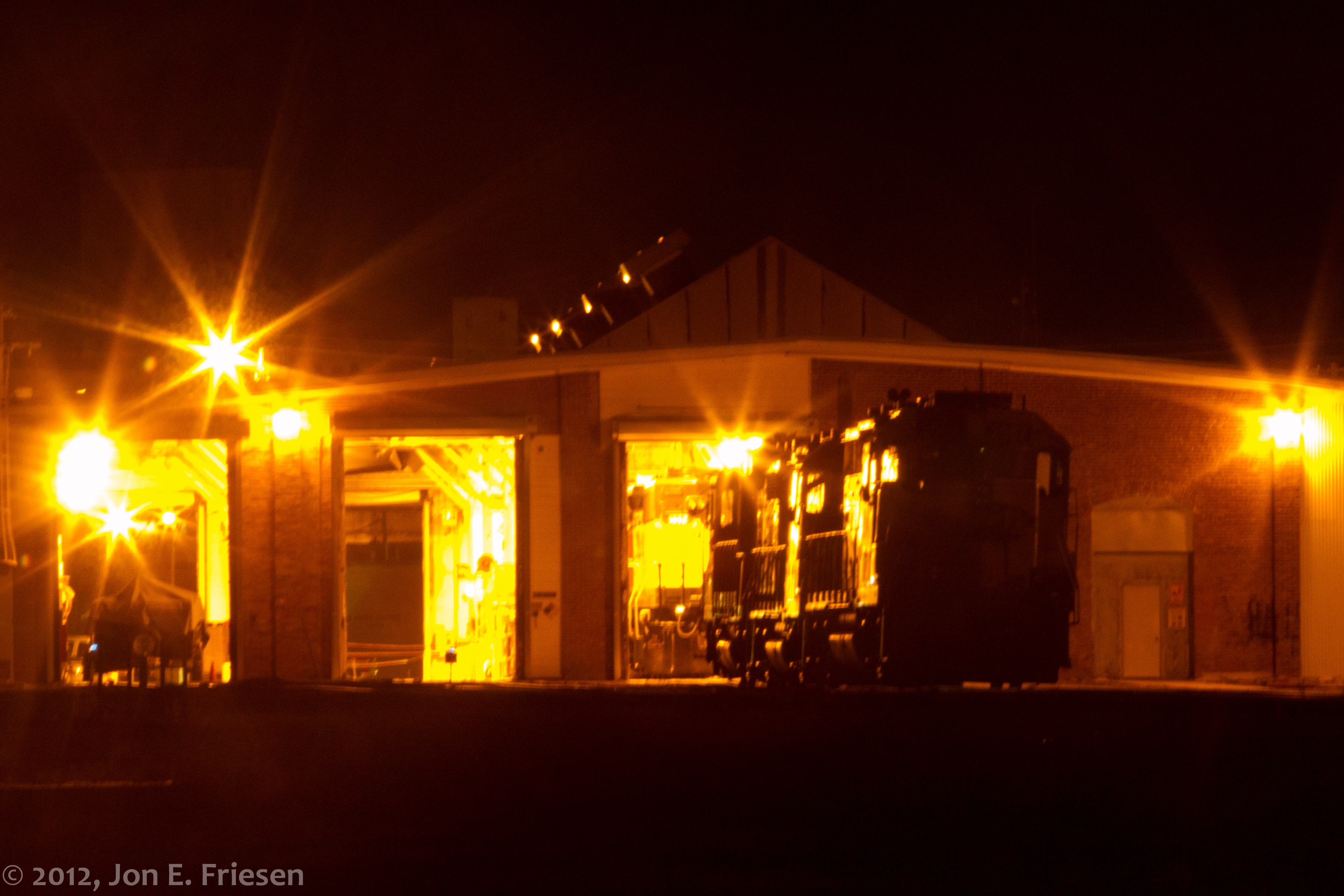 Newton has long been a railroad town. And the rail yard never sleeps. Train whistles (“train whistles” sounds much more romantic than “train horns”) sound through the night as workers ensure that the movement of freight continues without pause. Tonight’s view of the engine house is the photographic offering.